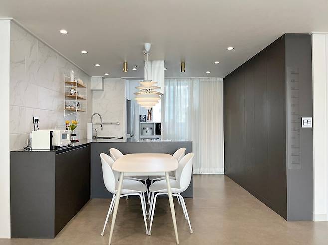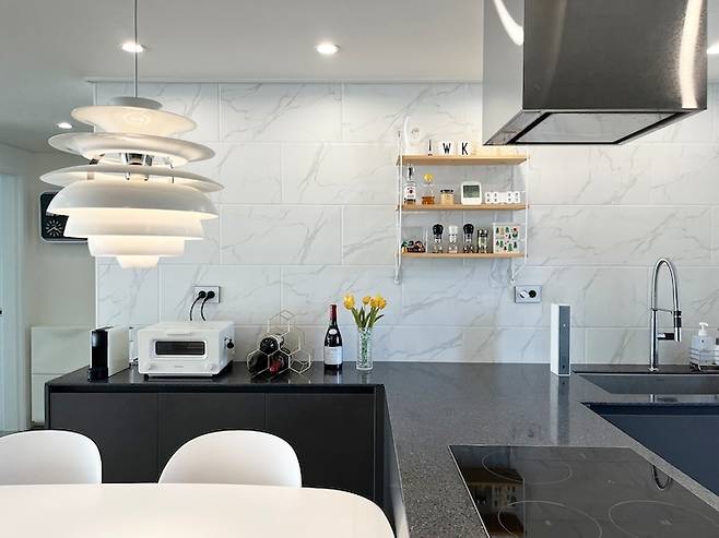 시각적으로 개방감을 주고 싶어 싱크대 쪽 상부장을 없앴고, 다소 지저분해 보일 수 있는 개수대 위치를 안쪽으로 배치했습니다. 조리대와 인덕션은 대면 구조로 구성하여 요리가 다 되면 바로 식탁에 놓을 수 있는 동선이라 만족합니다.