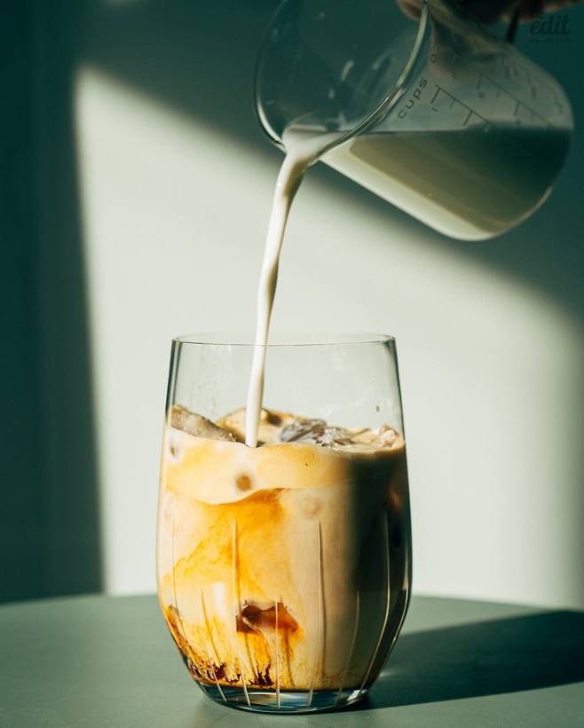 기본기가 좋으니 당연히 모든 레시피와 잘 어울리지만, 이 고소한 맛과 산미에 우유를 더하면 커피 맛을 한껏 더 끌어올릴 수 있습니다. 어렵지 않아요. 커피와 우유의 황금 비율이 1:1.5라는 것만 기억하시면 되거든요. 80ml의 더블 에스프레소 커피에 120ml의 스팀 밀크를 올려준 뒤, 마지막으로 우유와 커피가 잘 섞이도록 저어주면 완성입니다