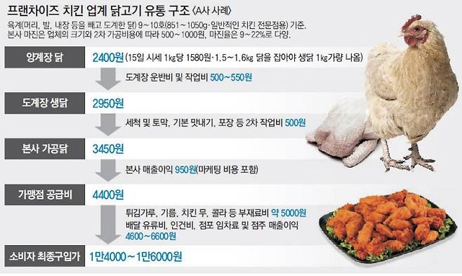 예를 들어, 농가에서 가공업체에 닭을 마리당 1,800원에 납품하면 가공업체는 닭을 도축한 뒤 프랜차이즈 업체에 3,600원선에 넘깁니다. 그리고 프랜차이즈 업체에서 가맹점에 4,500원에 판매하죠.