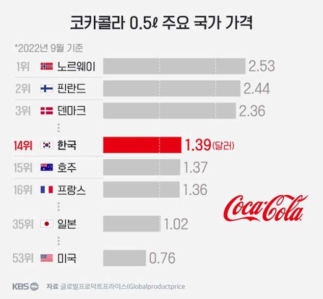 실제로, 가격 비교사이트 글로벌 프로덕트 프라이스닷컴에서 코카콜라 500㎖ 가격을 비교해본 결과, 한국이 92개국 중 14번째로 비싼 것으로 밝혀졌습니다.