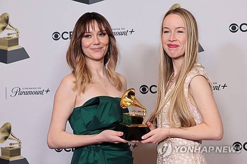 epa11128030 (L-R) Molly Tuttle and Bronwyn Keith-Hynes of Golden Highway, winners of the "Best Bluegrass Album" award for "City of Gold", pose in the press room during the 66th annual Grammy Awards ceremony at Crypto.com Arena in Los Angeles, California, USA, 04 February 2024. EPA/ALLISON DINNER