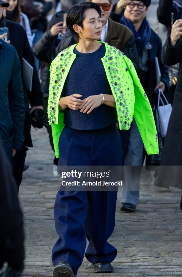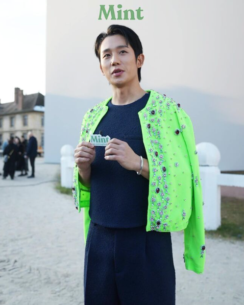 정해인의 이번 룩에서 단연 시선을 사로잡은 아이템은 형광 그린 컬러의 카디건이었습니다. 일반적인 니트 카디건과는 달리, 스팽글 장식이 가득한 이 카디건은 빛을 받을 때마다 반짝이며 존재감을 뽐냈어요.