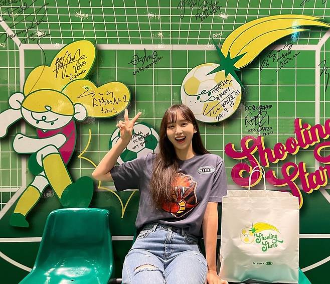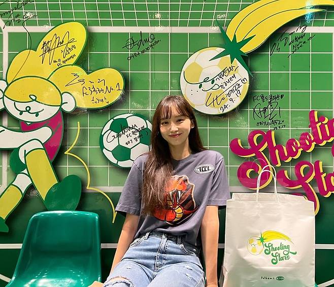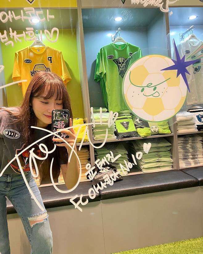 사진 속 윤태진은 프린팅이 있는 반팔티셔츠와 찢어진 연청바지를 입고 캐주얼한룩을 선보였다. 긴 생머리를 자랑하며 청순미도 함께 뽐냈다.