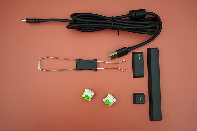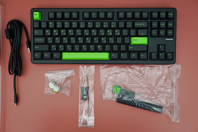 구성품은 여분의 몽돌스위치 2개와 키캡/스위치 풀러, 키캡 3개, 노이즈 필터가 달린 C타입 케이블, 설명서가 들어 있습니다. 키캡은 이색 포인트 키캡이 선장착되어 있습니다.
