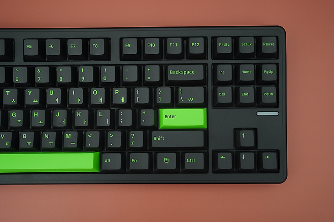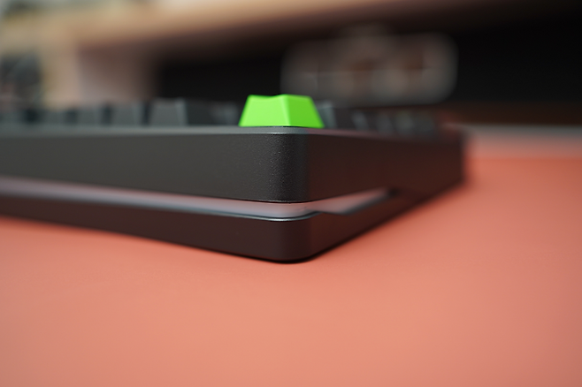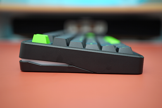 블랙과 네온 그린 2가지 색상으로 꾸며져 있으며 화살표키 위에 인디게이터가 위치해 있습니다. 인디게이터 하나로 배터리 상태나 CAPS LOCK의 사용유무까지도 확인이 가능합니다. 재질은 플라스틱인데 별도의 도장이나 도색이 입혀져 있지 않은 사출 그대로의 상태입니다. 표면을 조금 더 부드럽게 하거나 무광으로 했더라면 더 괜찮았을 것 같습니다.