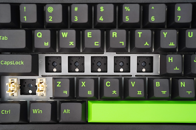 스위치를 장착하는 PCB 기판은 5핀 타입으로 되어 있으며 PC보강판에는 10개의 가스켓이 마운트 되어 눌렀을 때 푹신한 타건감을 전해줍니다. 통울림을 줄이기 위한 5개의 흡음 필름, 흡음재가 적용되었습니다.