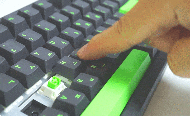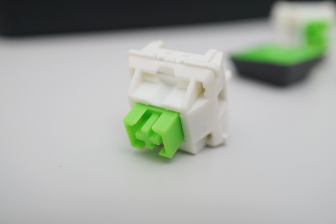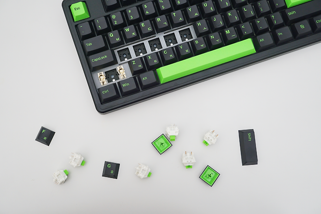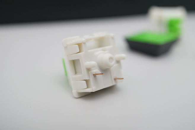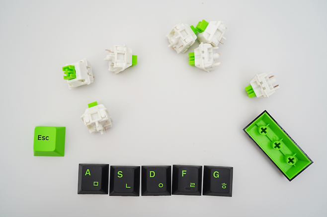 Bsun사와 협업해서 개발한 화이트 몽돌 스위치는 5틴 타입으로 화이트/네온 그린 색상으로 이뤄져 있습니다. 작동압력이 40g인 만큼 누를 때 일반적인 키보드보다도 압력이 덜하며 공장윤활이 되어 있어 서걱임 없이 부드러운 느낌을 전해줍니다. 개인적으로도 저압을 선호하는 터라 제가 사용하는 환경에 아주 잘 맞는다는 느낌입니다.