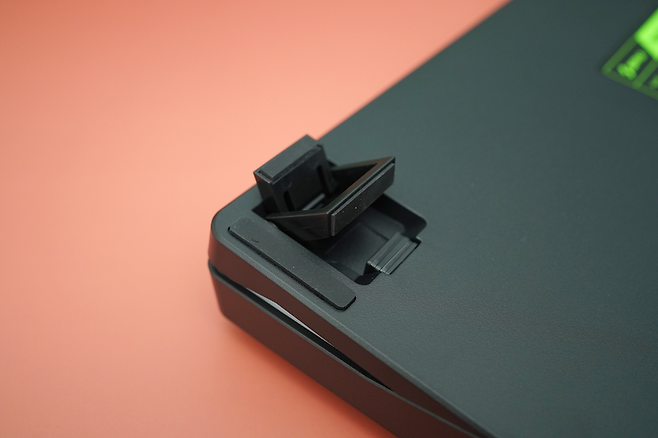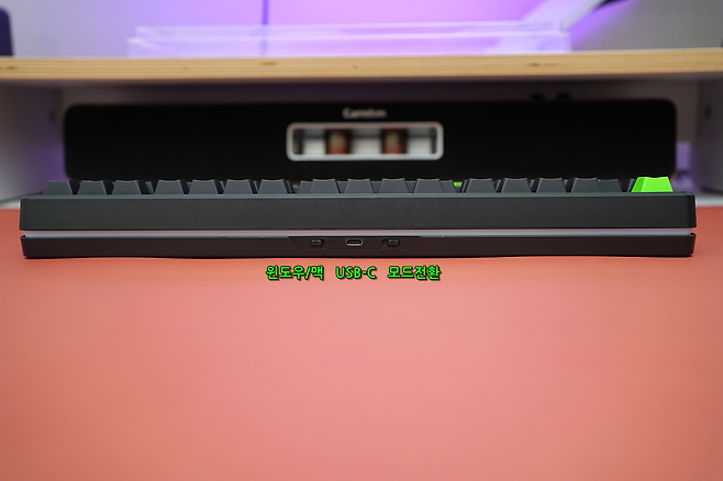 모드 전환 버튼과 C타입 포트, 윈도우/맥 전환 버튼은 윗면에 노출되어 있습니다. C타입 포트가 밖에 노출되어 있기 때문에 C타입 케이블이 두꺼운 타입이라도 걸림없이 사용할 수 있습니다. 어떤 키보드들은 하우징 안쪽으로 들어가 있어 전용 케이블 이외에는 사용이 어렵더라고요.