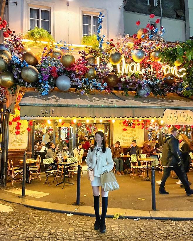 프랑스의 로맨틱 도시, 파리의 한 카페 앞에서 찍었어요