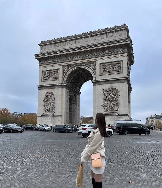 로맨틱한 파리 분위기에 맞춰서 화이트 무스탕과 무릎까지 오는 롱부츠를 입었어요