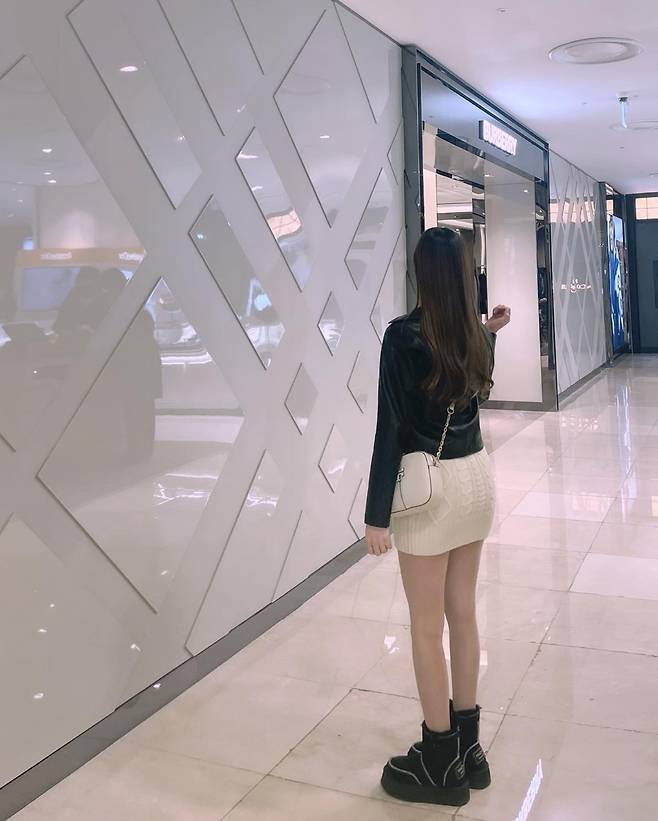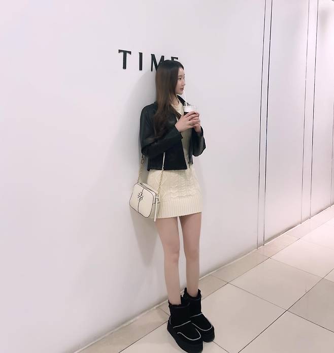 자켓과 부츠는 블랙, 원피스와 가방은 아이보리계열로 맞췄어요