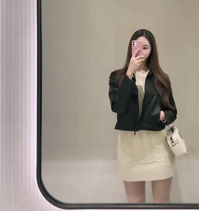 기본 니트 미니 원피스 위에 가죽 자켓으로 평범한 데일리 코디지만