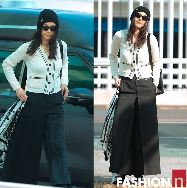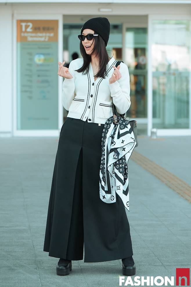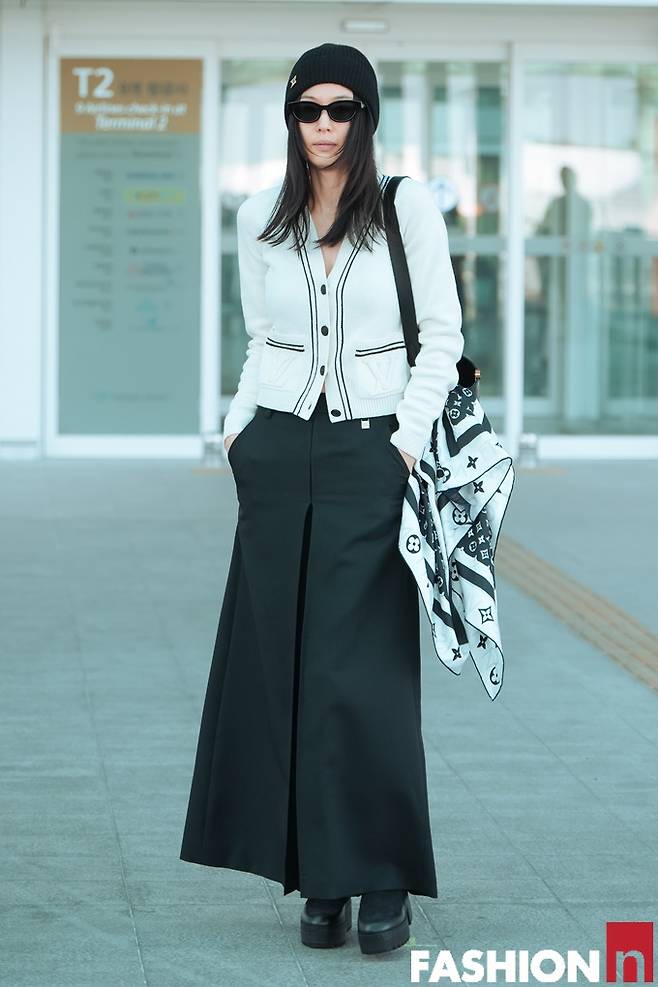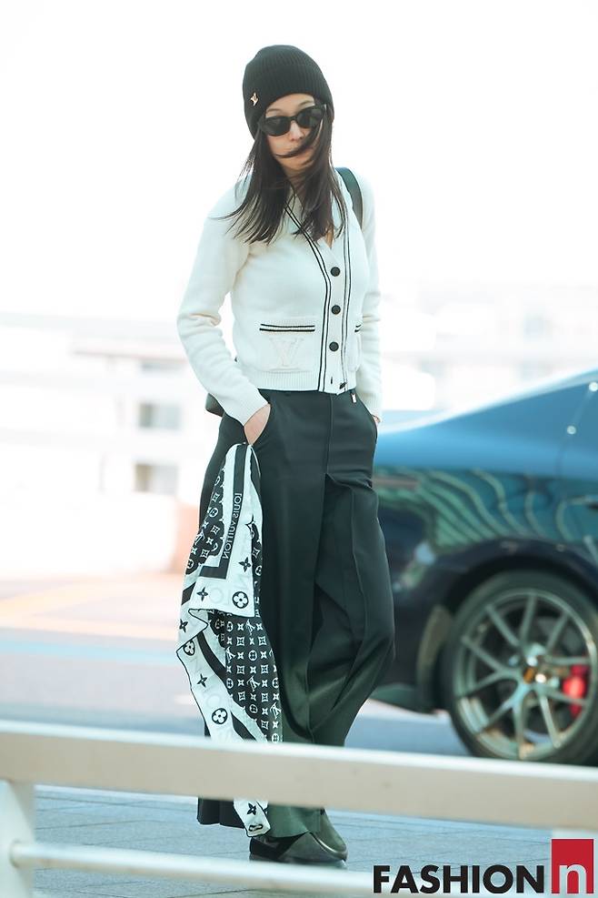 이날 전지현은 와이드 핏 블랙 치마바지에 화이트 니트 카디건을 입고 블랙 비니와 선글라스를 매치한 출국룩으로 럭셔리하면서도 패셔너블한 핫한 스타일을 완성했다.
