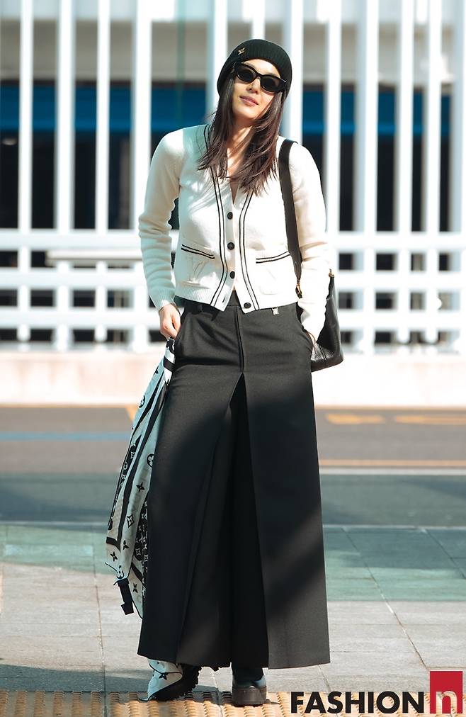 배우 전지현이 비니에 와이드 핏 치마바지로 핫한 럭셔리룩을 선보였다.