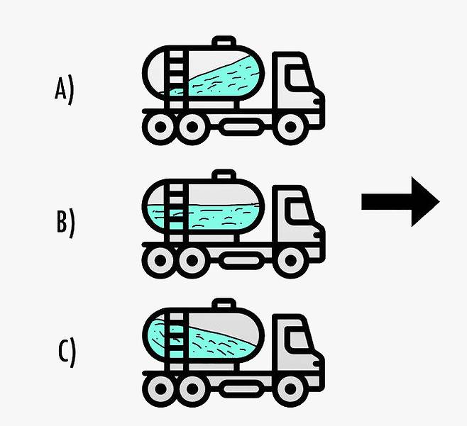 다음 3개의 트럭 중에 앞으로 움직이고 있는 트럭은 무엇인가요?
