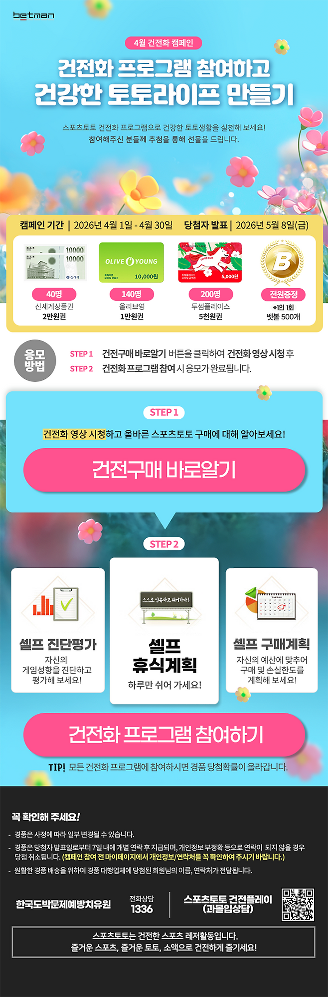 서울올림픽기념국민체육진흥공단(이사장 하형주)이 발행하는 체육진흥투표권 스포츠토토의 공식 인터넷 발매사이트 베트맨이 2026년 4월 건전화 캠페인 '건전화 프로그램 참여하고 건강한 토토라이프 만들기' 이벤트를 오는 30일까지 진행한다.