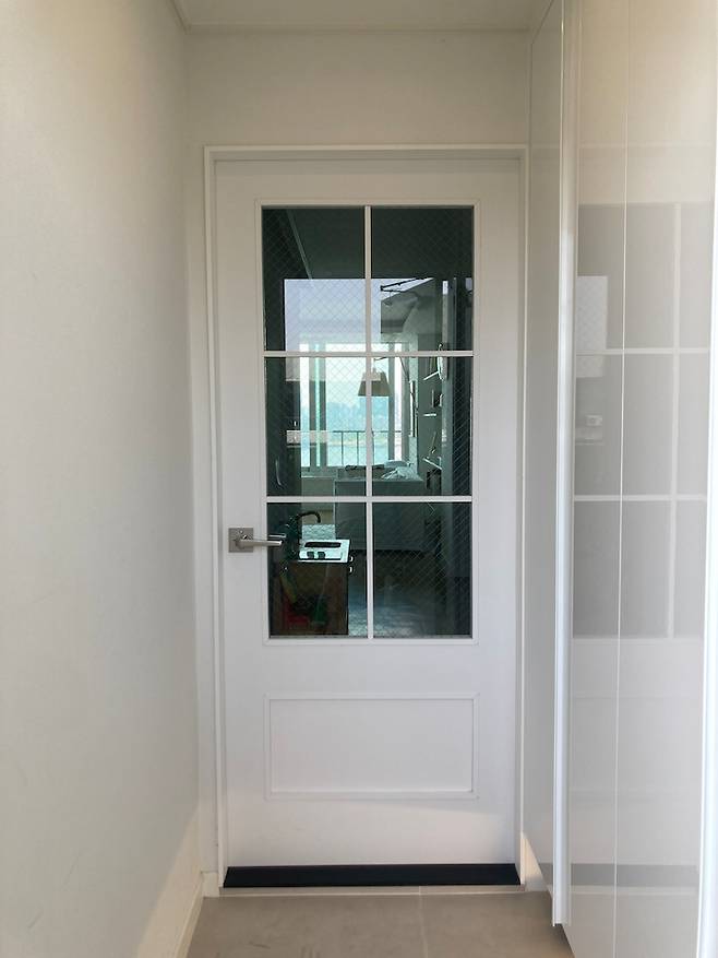중문은 여닫이문으로 넓어 보일 수 있게 공간이 보이는 문으로 선택했어요. 격자무늬가 들어간 문을 선택해서 제가 좋아하는 프렌치 감성을 살렸어요.