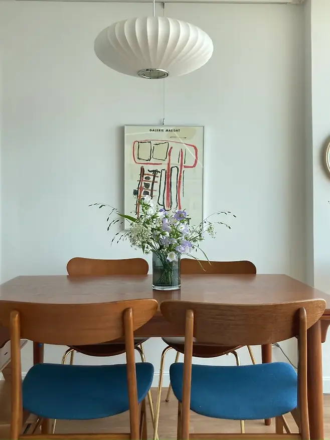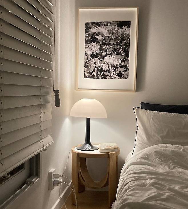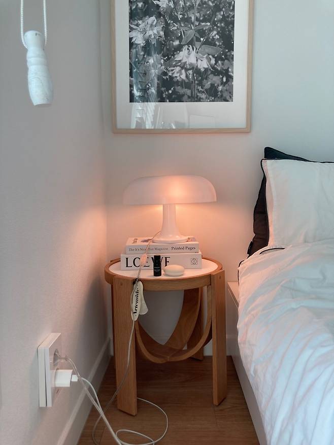 저는 주기적으로 스탠드나 가구 배치를 바꾸는 편이에요. 기존 배치가 익숙해져 지루해질 때쯤 가구나 소품의 위치를 바꿔 집에 생기를 넣어주면 또 다른 느낌이 들거든요. 머쉬룸 램프는 신혼 때 구매한 빈티지 조명인데 스탠드 교체만으로도 다른 분위기를 연출할 수 있었어요.