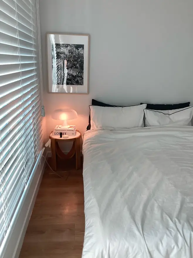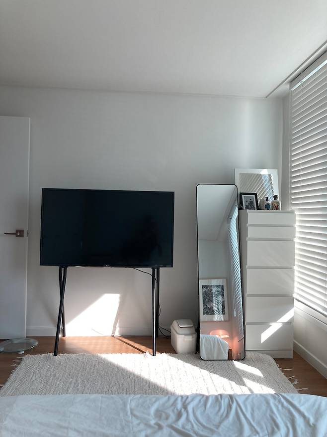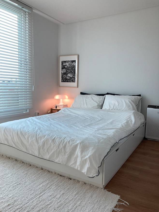 안방은 깔끔하고 심플한 화이트로 인테리어를 맞추고 바닥에는 러그를 깔아 따뜻한 느낌을 연출해봤어요. 그리고