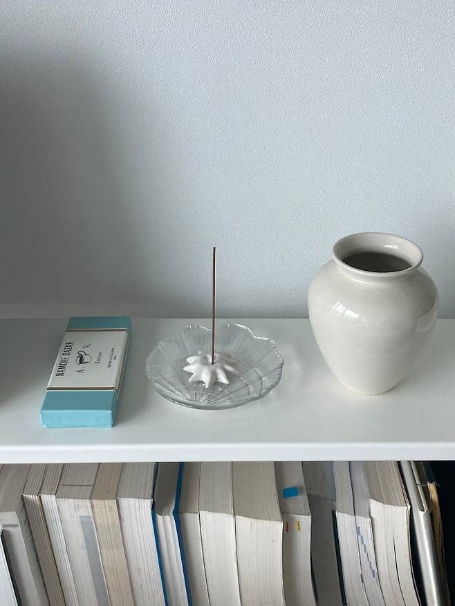 인센스 켜 놓는 것을 좋아해서 인센스 스틱을 선반에 두고 아침마다 환기하면서 스틱을 하나씩 태웁니다. 화병은 실제 화병으로도 쓰지만 이렇게 아무것도 없이 두면 오브제로 충분한 역할을 해서 만족하면서 쓰고 있어요.