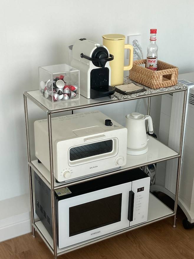 다이닝 테이블이 거실에 있다 보니 빵이나 간편식들을 먹기 위해 선반을 두어 전자레인지 토스터, 커피머신을 두었어요. 주방까지 가야 하는 동선을 줄여줘서 편리해요.