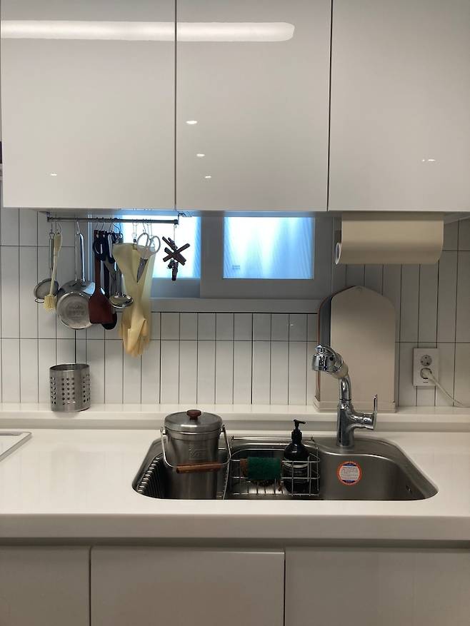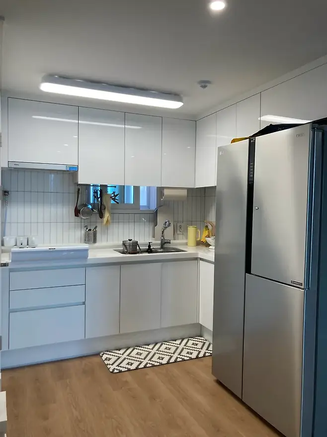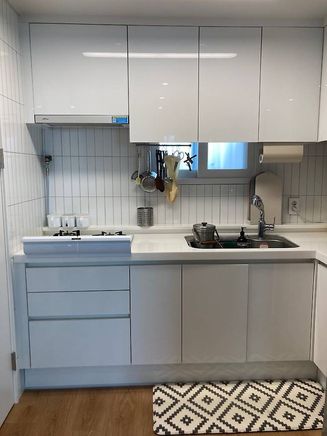 전체적인 톤을 전부 화이트로 맞췄어요. 인테리어 사장님께서 싱크대 상판을 다른 색으로 권유하셨으나 저는 주방이 좁기 때문에 한 톤으로 하는 게 나을 거 같아서 전부 한 톤으로 맞췄는데 잘 선택한 거 같아요. 타일은 세로로 좁은 형태의 타일을 선택해서 좀 더 길어 보이는 효과를 주었어요.