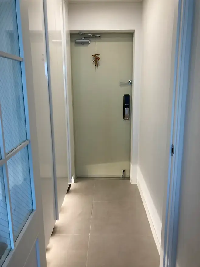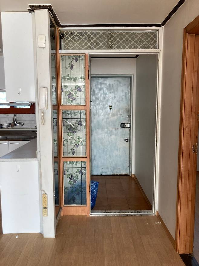 현관 시공 전 사진이에요. 중문이 없어서 중문을 설치하고 타일 신발장 현관문 전체 교체했어요.