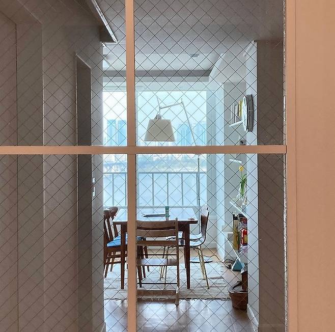 외출 후 집에 돌아와 현관문을 열면 격자무늬 안에 거실 한쪽이 보이는데 마치 액자처럼 집의 모습이 담겨서 기분이 좋아져요.