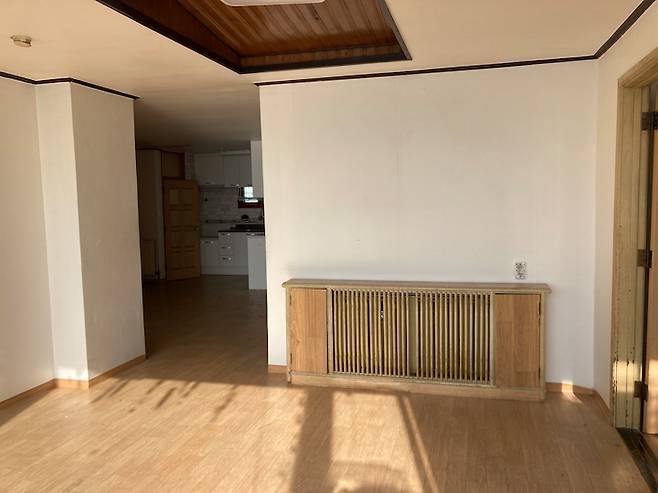 거실 왼쪽 벽면 비포 사진이에요. 서재가 붙어있고 베란다 확장 공간에 서재와 연결되는 베란다 문을 새로 만들었어요.