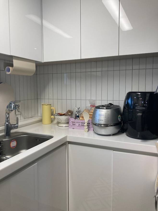 ㄱ자로 꺾이는 공간에 주방 물건과 밥솥, 에어프라이어를 두고 사용해요. 냉장고가 옆에 있어서 정면에서 봤을 때 보이지 깔끔하게 보여요.