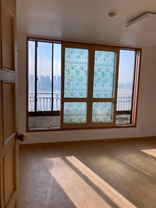 시공 전 거실 모습이에요. 바닥부터 천장 샷시(새시) 전부 다 수리를 거쳐야만 했던 공간이에요. 이전에는 거실과 주방 바닥에 난방이 없고 라디에이터로만 난방할 수 있었어요. 하지만 뷰는 예술이었어요.
