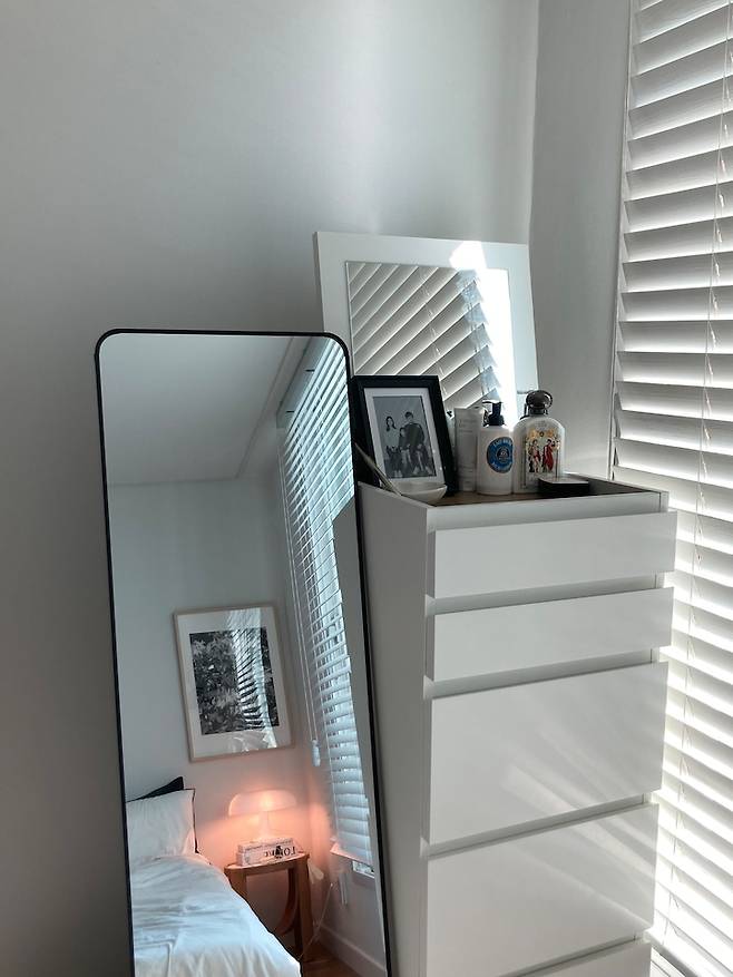 그 옆엔 전신거울과 이케아 수납장 겸 화장대를 두어서 화장품과 자잘한 소품들을 정리해 두었어요. 침대와 화장대를 같은 브랜드로 구매해서 통일감을 주었어요.