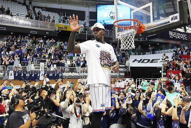 | ▲ 팬들에게 인사하는 라건아 5일 경기도 서수원칠보체육관에서 열린 프로농구 챔피언결정전 5차전 수원 KT 소닉붐과 부산 KCC 이지스의 경기. 이날 경기에서 승리하며 챔피언 자리에 오른 KCC 라건아가 그물 세리머니 후 팬들에게 인사하고 있다. |