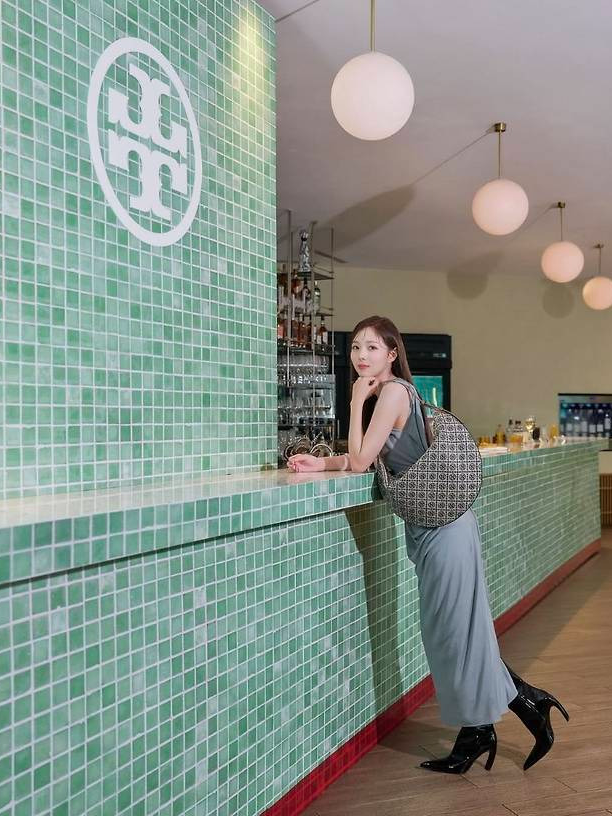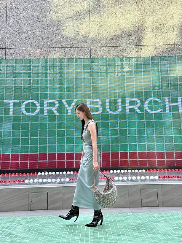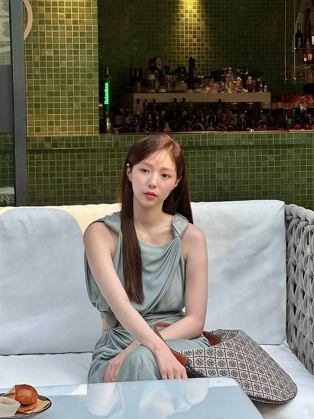 그린 타일 바를 배경으로 포착된 그녀는 실키한 텍스처의 드레이프 슬리브리스 원피스를 착용해 우아하면서도 절제된 아름다움을 드러냈습니다.