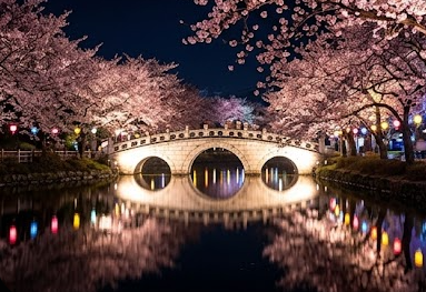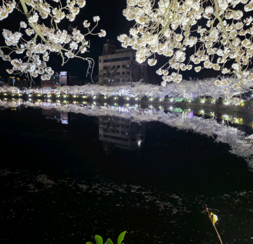 ▶ 조명 + 벚꽃 + 물 반영이 동시에 만들어내는 분위기