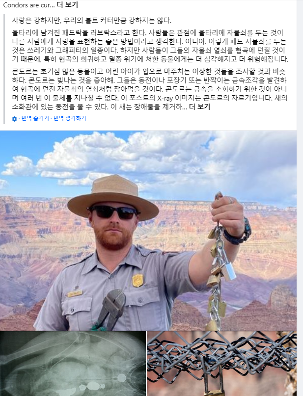 공원 측이 이렇게까지 하는 이유 중 하나는 그랜드캐니언에서 서식하는 맹금류 콘도르가 호기심 때문에 자물쇠 열쇠를 집어 삼키는 경우가 빈번해지고 있기 때문인데요. 실제로 최근 구조돼 수술을 받은 콘도르 뱃속에서 관광객들이 던진 열쇠와 동전 등이 다수 발견됐다고 합니다.