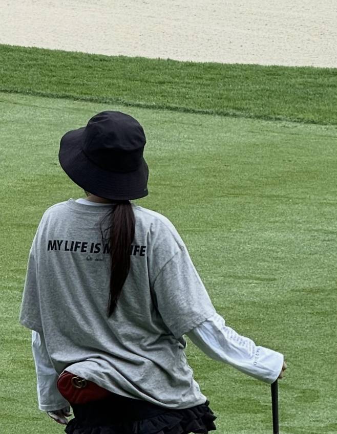 황신혜는 레터링 프린트가 돋보이는 그레이 오버핏 티셔츠에 블랙 프릴 미니스커트를 매치해 발랄한 분위기를 살렸으며, 무릎까지 오는 스트라이프 삭스와 노란색 골프 장갑으로 위트를 더했습니다.