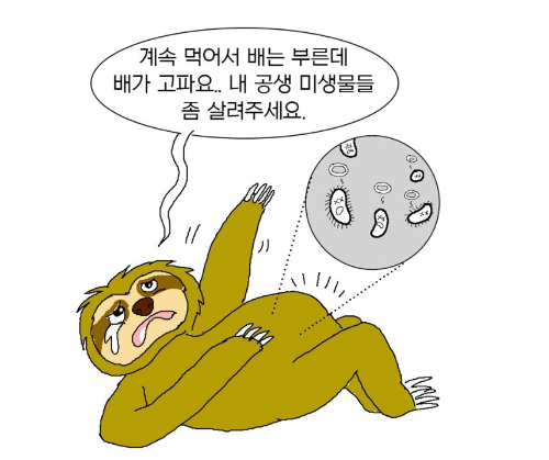 공생 미생물은 단순히 존재하는 것이 아니라, 숙주의 에너지 대사, 영양소 흡수, 면역계, 신경계와 긴밀하게 연결돼 있다. 코스타리카의 나무늘보는 낮은 대사율과 느린 소화 속도를 보이는데, 이들의 에너지 대사는 위장 미생물에 크게 의존한다. 그러나 기후 변화로 공생 미생물이 사라지면서 '배가 부른데 굶어 죽는' 현상이 발생하기도 한다 (그림 4).