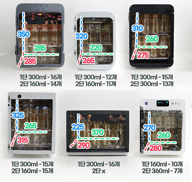 때문에 노써치가 여러분의 수고를 덜어드리고자 젖병소독기 6개의 제품 사이즈를 직접 측정하여 수납력을 테스트 해본 결과,