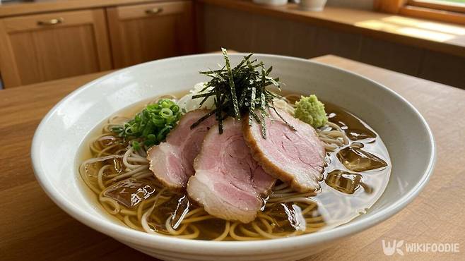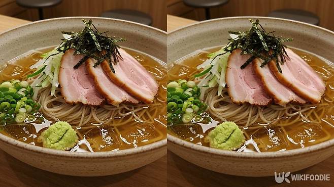 무는 강판에 갈아 면포에 싸서 물기를 짠다. 너무 많이 넣으면 육수가 탁해지므로 한 스푼이면 충분하다. 간 무를 육수에 섞은 뒤 쪽파, 김가루, 와사비를 준비한다.