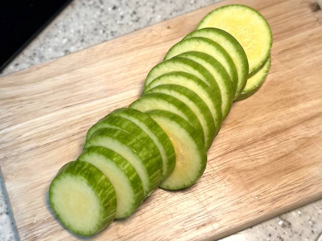 먼저 애호박은 1cm 두께로 썰어줄게요.