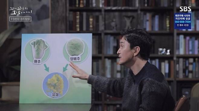장춘은 연구 끝에, 유채가 배추와 양배추의 교잡종이라는 걸 발견했어. 누군가 인위적으로 교잡한 게 아니라 자연 상태에서 교잡해 탄생한 게 유채라는 걸, 장춘이 발견한거야. 그리고 또 하나, 배추와 흑겨자가 교잡해 나온 게 갓, 갓김치의 그 갓이라는 걸 발견했어.