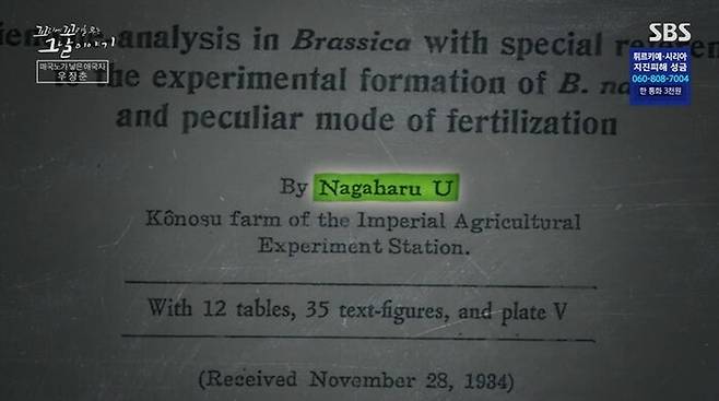 이건 우장춘이 쓴 '배추 속 식물에 관한 게놈 분석'이란 논문이야. 그런데 표지에 '나가하루 우'라고 적혀있어. 스나가 라는 일본 성을 얻었는데도 장춘은 계속 아버지의 성 우 씨를 고집한 거야. 세계를 뒤흔든 그 '종의 합성' 논문에도 한국 성을 쓴 거지. 자신에게 충격을 줬던 김철수의 영향이 컸던 걸까. '우' 라는 성이 장춘에게는 어떤 의미였을까?