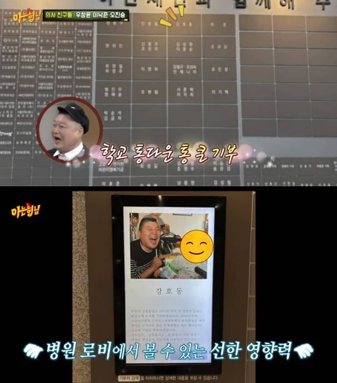 이에 김희철은 "형이 의외로 좋은 일을 많이 한다"고 말했고, 오진승과 우창윤 역시 "기부 금액에 따라 기부자의 이름이 새겨지는 공간이 있는데, 강호동 씨의 이름은 상당히 큰 규모"라고 덧붙였습니다.