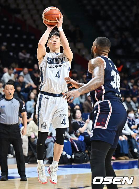 고양 소노 이재도가 부산 KCC 숀롱의 마크를 피해 슛을 시도하고 있다.
