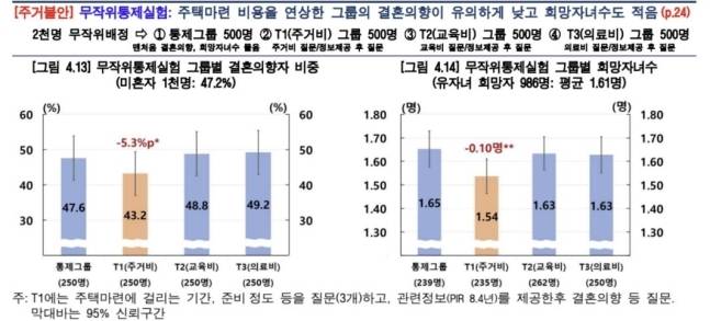 주거·교육·의료비 관련 각 질문을 먼저 던져 비용 요인을 연상시킨 뒤 결혼 의향을 물어보자, 주거비 정보를 접한 미혼자 그룹의 결혼의향 비율(43.2%)이 전체 미혼자 평균(47.2%)보다 뚜렷하게 낮았다.