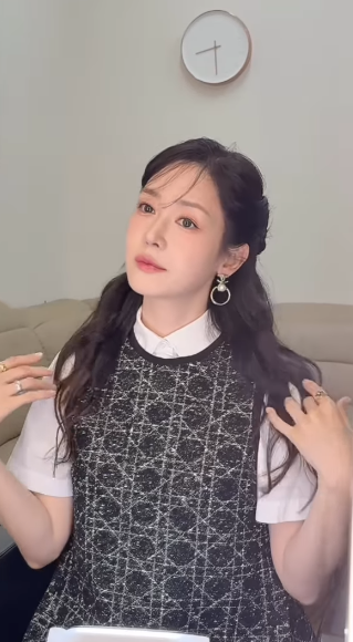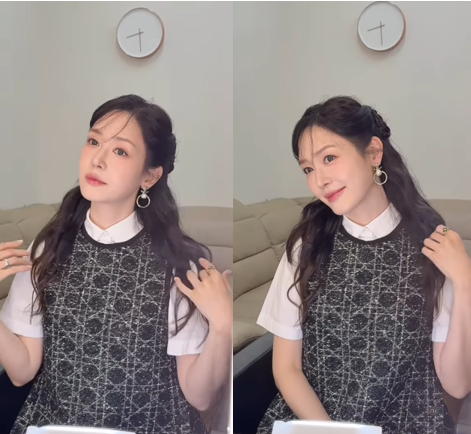 긴 웨이브 머리와 우아한 이어링, 그리고 단정한 셔츠 원피스로 20대 못지않은 청초함을 뽐냈다.