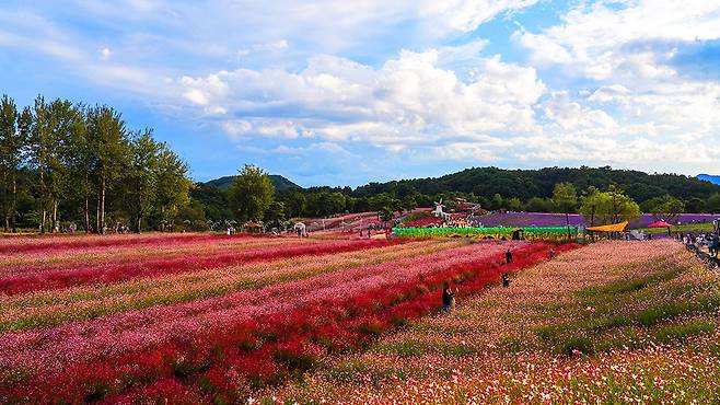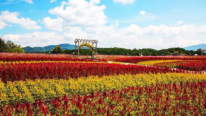 철원군 동송읍 한탄강 유역에 자리한 고석정 꽃밭은 축구장 22개 크기에 달하는 16만㎡ 대지 위에 조성되었습니다. 가을이면 맨드라미, 천일홍, 코키아, 핑크뮬리 등 10여 종의 꽃이 파노라마처럼 이어지며, 방문객을 압도하는 장관을 선사합니다.