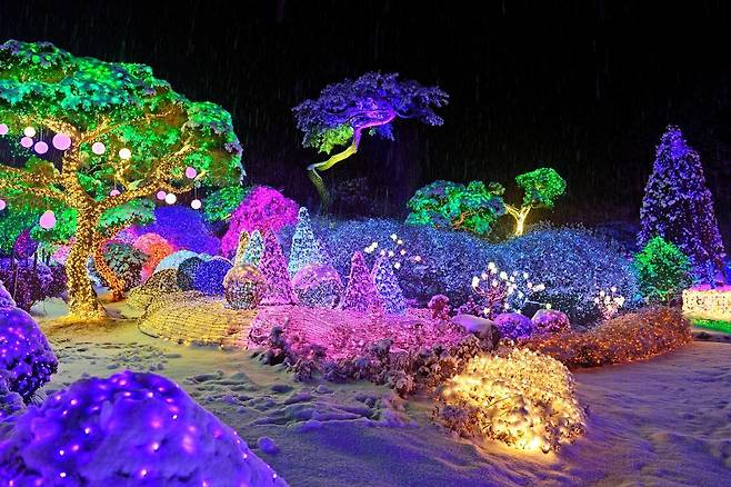 경기도 가평군 상면에 자리한 아침고요수목원은 겨울이면 더 낭만적으로 변하는 경기도 여행지입니다. 오색별빛정원전이라는 야간 조명 축제로 동네방네 화려하게 치장하는 덕분이죠. 숲길을 따라 화려하게 흘러드는 조명과 나지막한 겨울 공기가 둘만의 대화를 더욱 잔잔하게 만들어줍니다.