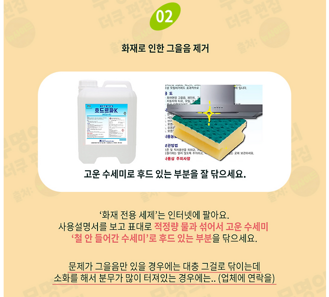 주방 선반이나 후드 기름때 → 뜨거운 물 + 주방세제 적신 수건으로 닦기